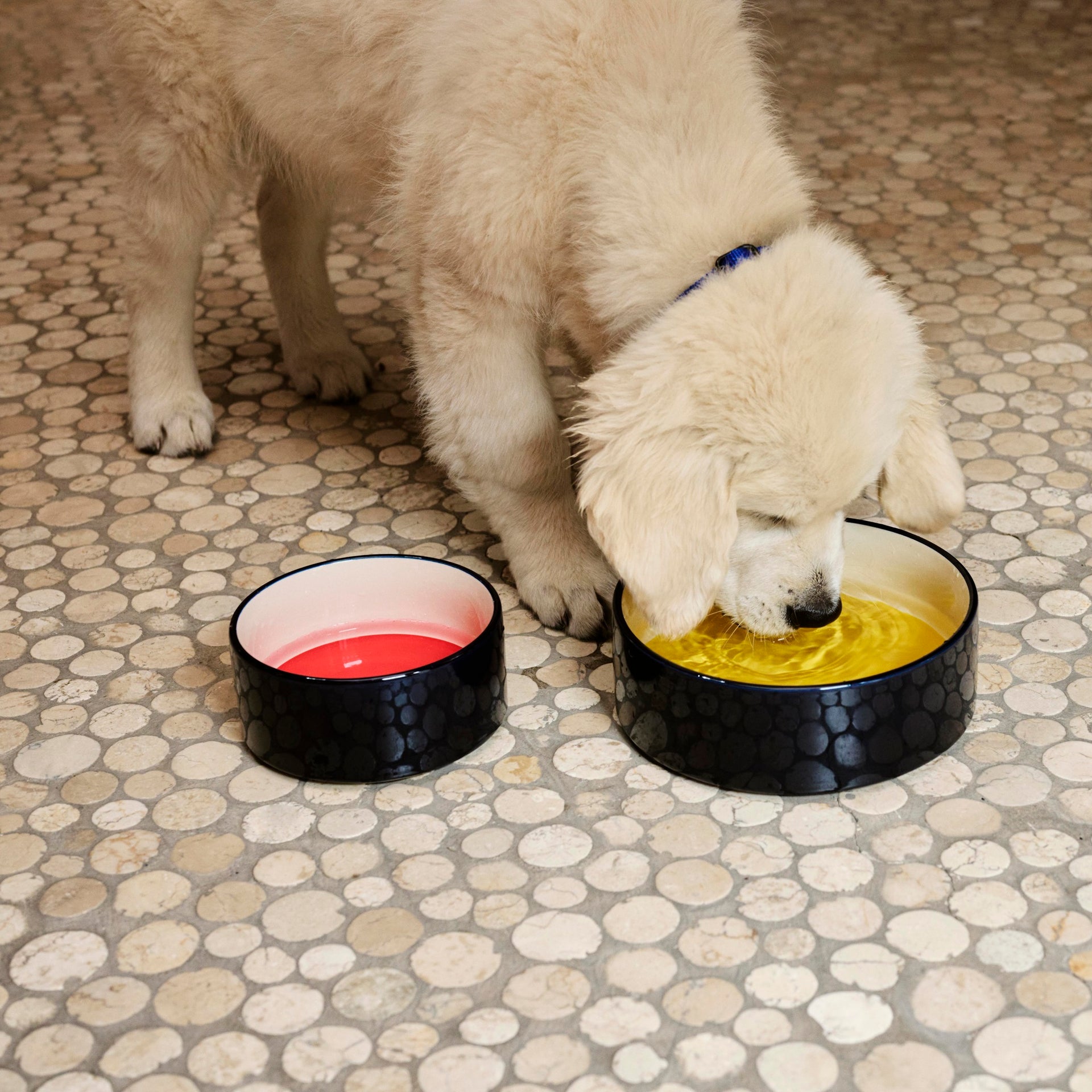Der Fressnapf besteht aus hochwertigem, schwerem Steinzeug und besticht durch ein stilvolles Tricolore-Design. Er ist in zwei Größen erhältlich und eignet sich ideal für Hunde aller Größen. Das Gewicht sorgt dafür, dass er während des Fressens stabil bleibt und nicht verrutscht.
