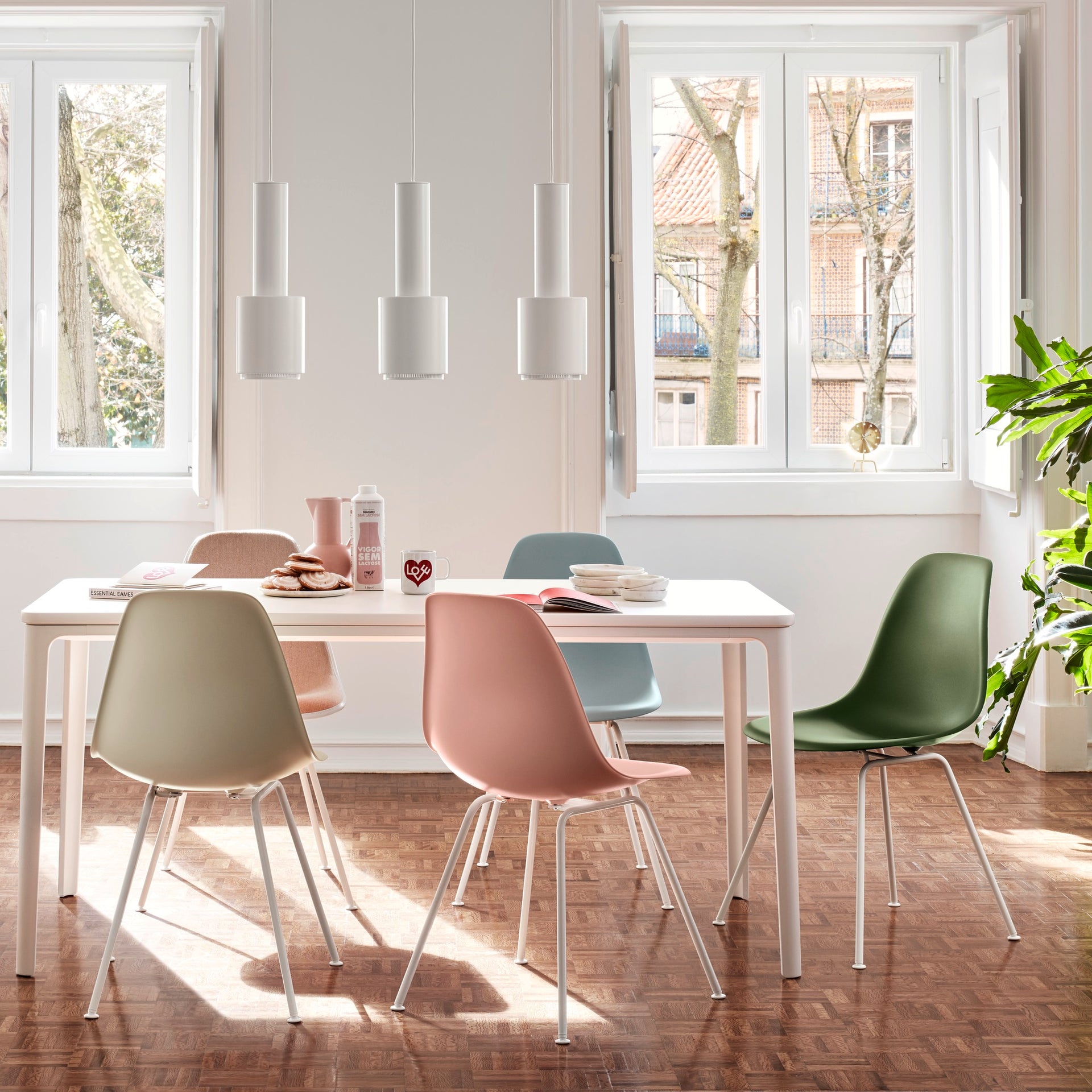 Das dezente vierbeinige Stahlrohrgestell des Dining Height Side Chair X-Base (DSX) verleiht den Stühlen eine zeitlos minimalistische Optik und Stabilität zugleich. Die Eames Plastic Chairs RE sind für eine Vielzahl von Einsatzbereichen geeignet: