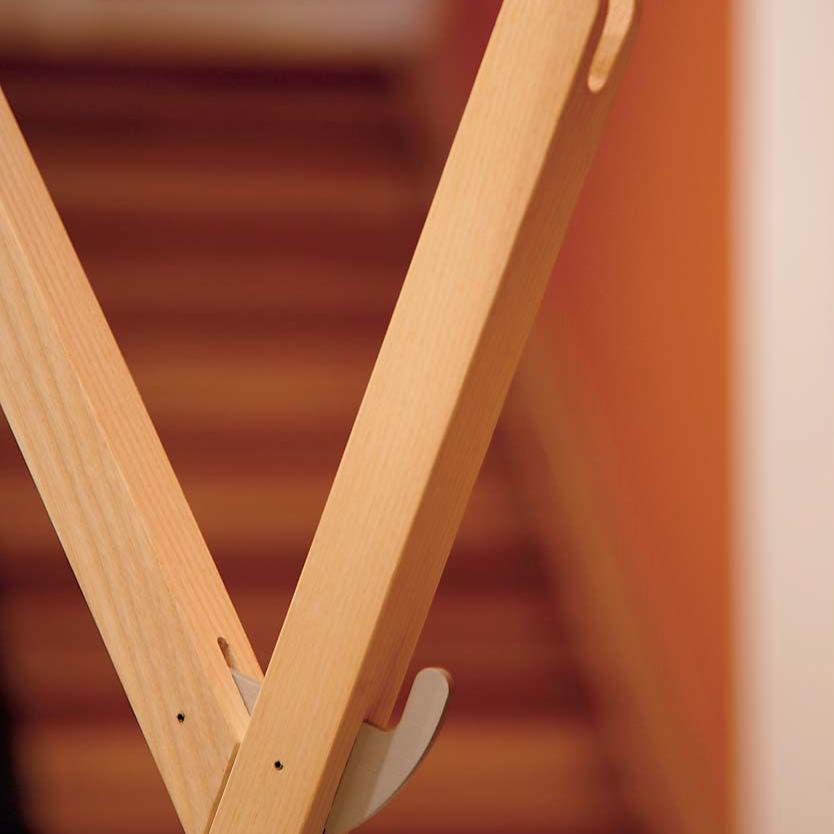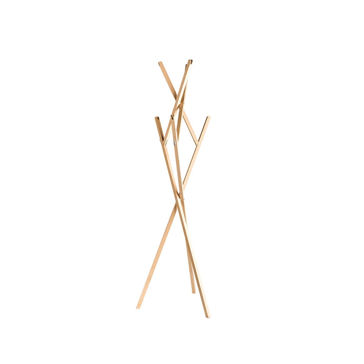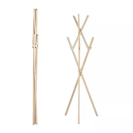 Zweite Position: Nach dem Ausklappen steht der Garderobenständer nun leichtfüßig und breitbeinig da. Seine Arme reckt er gegenläufigen in die Höhe.