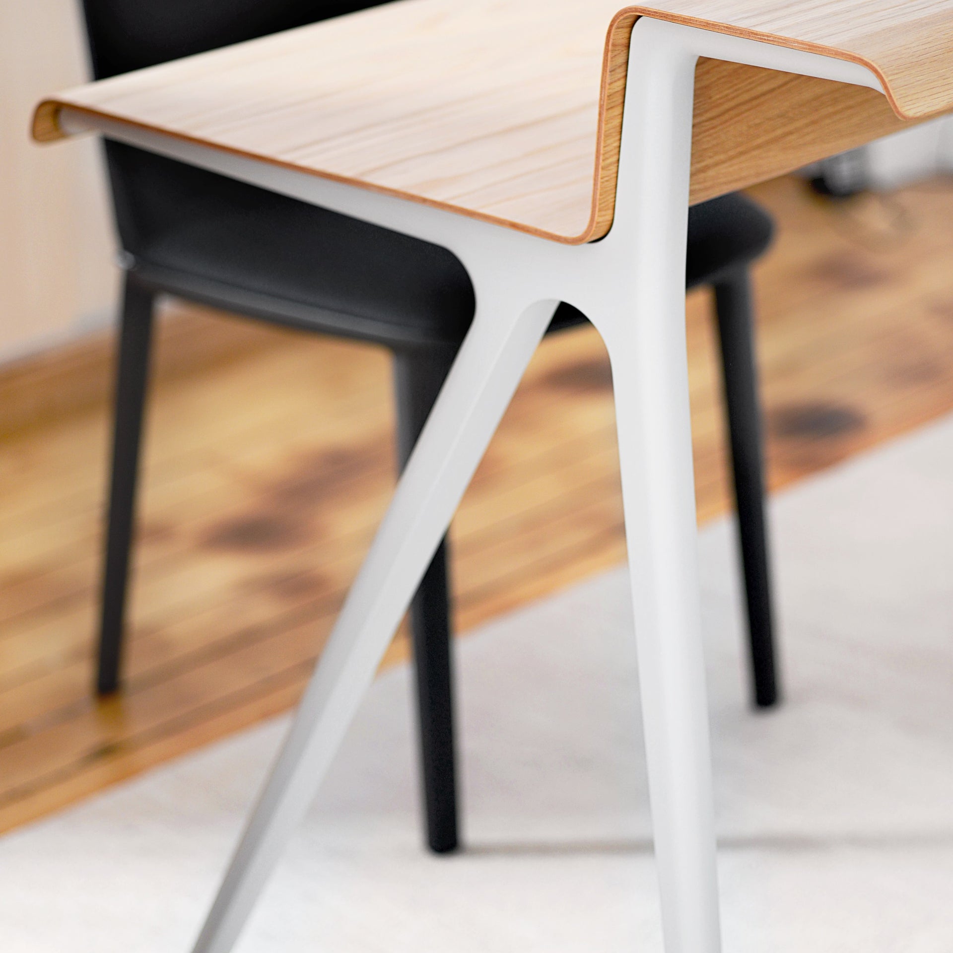 Der Courier Schreibtisch entworfen von Ronan Bouroullec für Vitra ist ein formal ansprechendes Objekt, das sowohl Schreibtisch als auch Skulptur ist. Mit seiner minimalistischen Form und einer durchdachten Materialwahl fügt sich der Tisch perfekt in moderne Wohnräume ein und setzt dabei stilvolle Akzente. Von der Seite betrachtet erinnert die Silhouette des Schreibtischs an einen Serifen-Buchstaben – daher der Name Courier, der für eine der bekanntesten Serifenschriften steht.