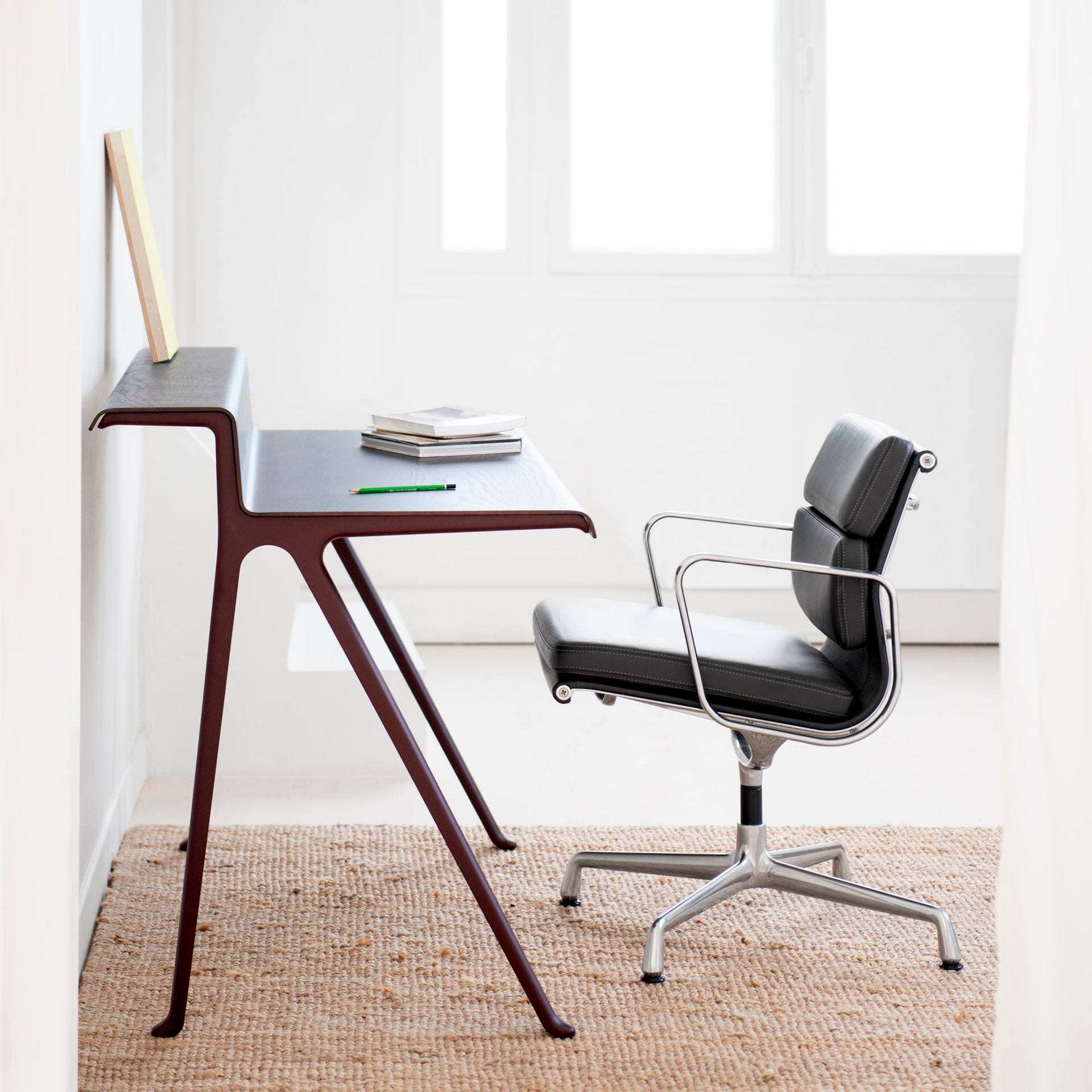 Der Courier Schreibtisch entworfen von Ronan Bouroullec für Vitra ist ein formal ansprechendes Objekt, das sowohl Schreibtisch als auch Skulptur ist. Mit seiner minimalistischen Form und einer durchdachten Materialwahl fügt sich der Tisch perfekt in moderne Wohnräume ein und setzt dabei stilvolle Akzente. Von der Seite betrachtet erinnert die Silhouette des Schreibtischs an einen Serifen-Buchstaben – daher der Name Courier, der für eine der bekanntesten Serifenschriften steht.
