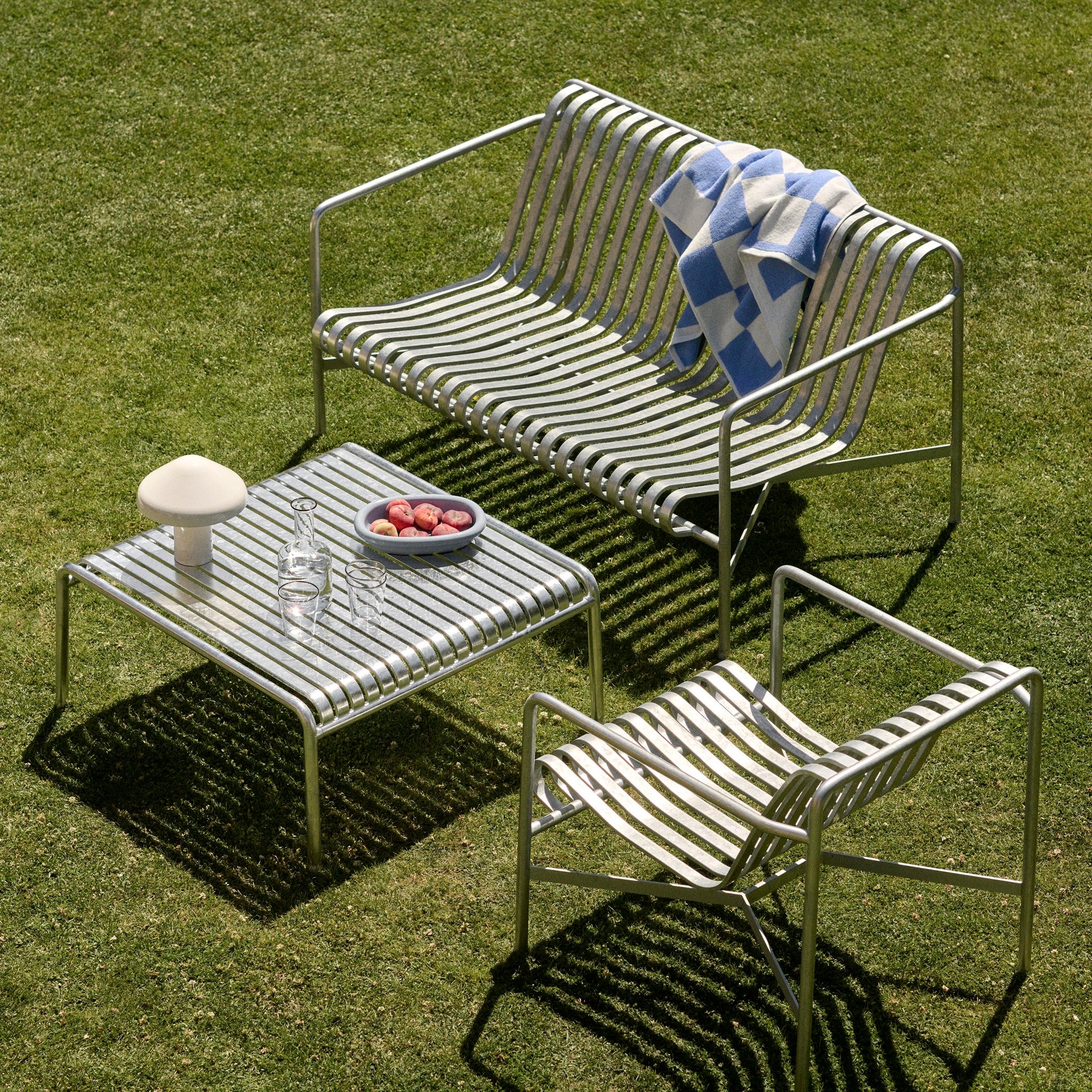 Der Palissade Tisch in niedriger Version, entworfen von Ronan und Erwan Bouroullec für HAY, vereint minimalistisches Design mit robustem Material, ideal für den Einsatz im Freien. Gefertigt aus pulverbeschichtetem oder feuerverzinktem Stahl, trotzt der Tisch wechselhaften Witterungsbedingungen und bleibt dank seiner pflegeleichten Struktur frei von Wasseransammlungen.