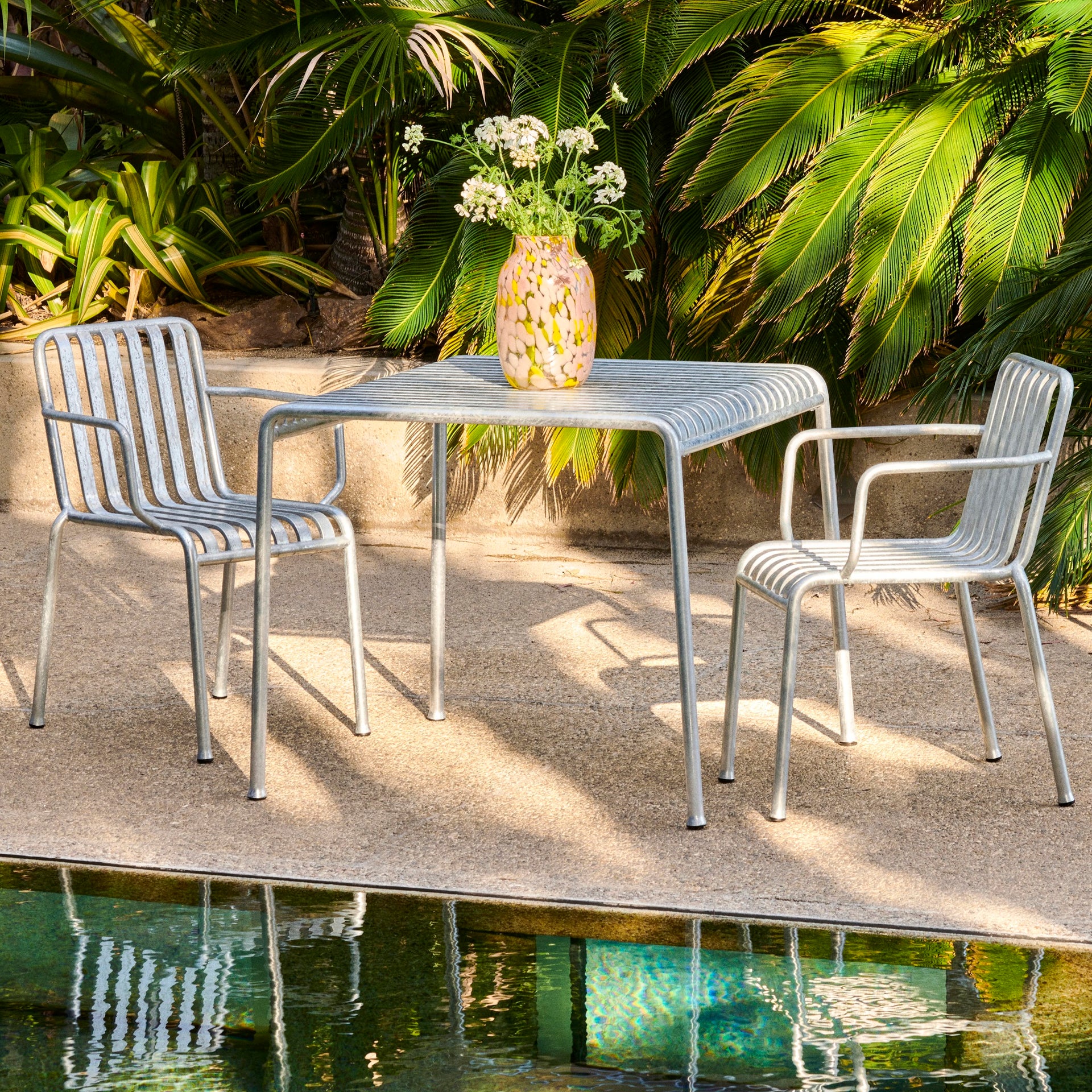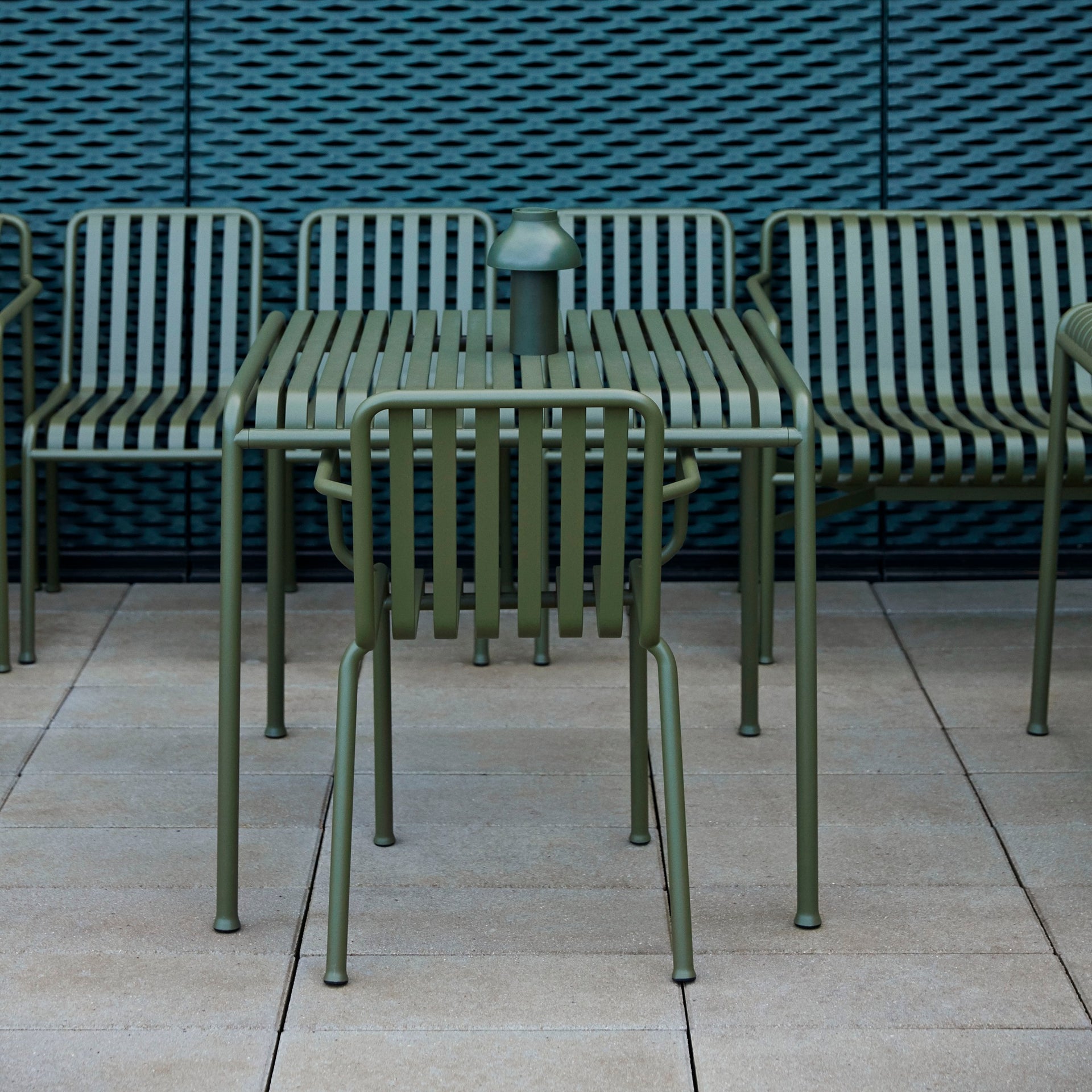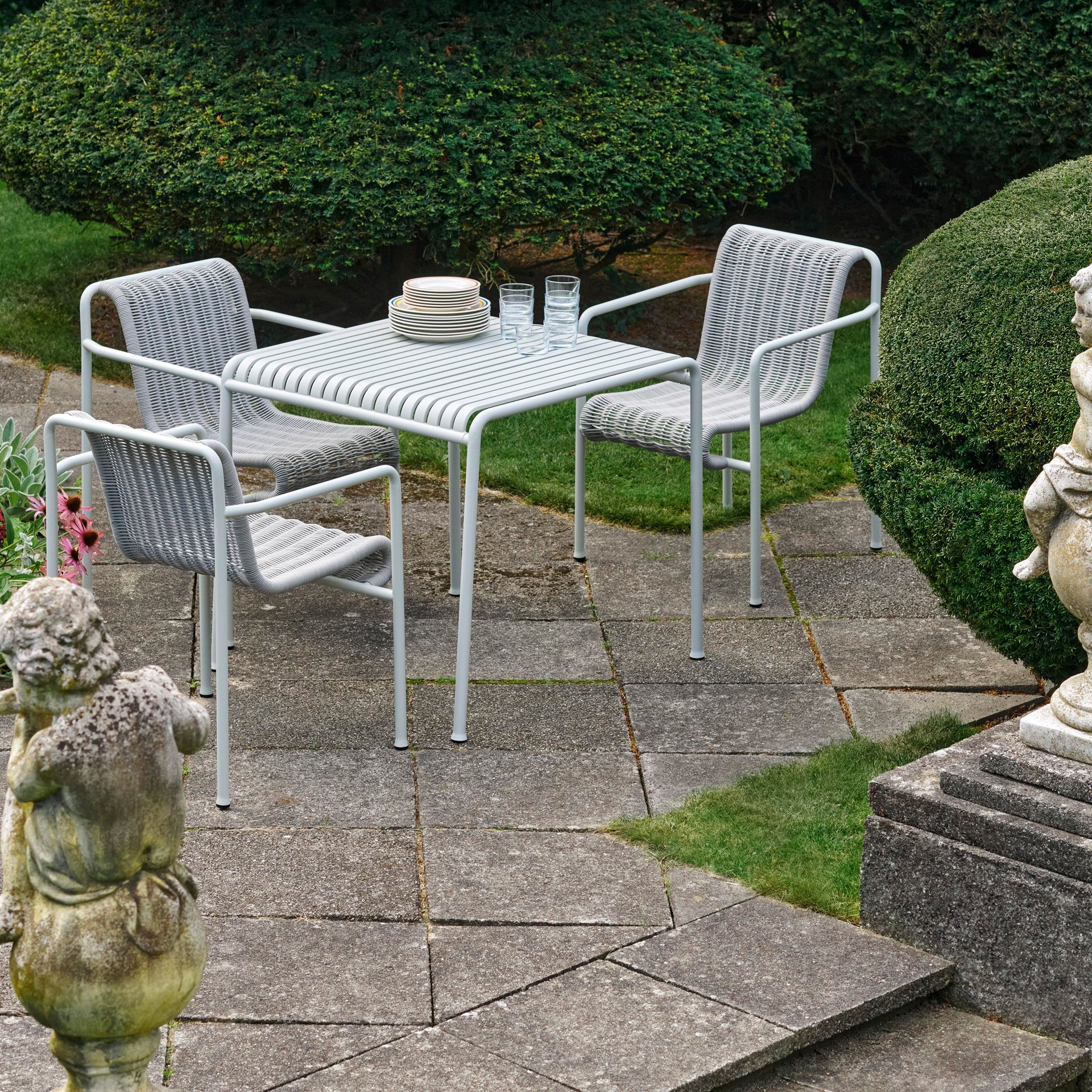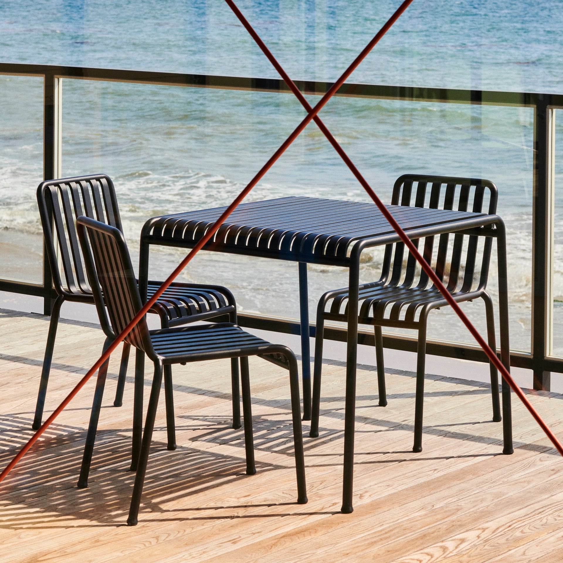 Ob auf Terrassen, Balkonen, in urbanen Gärten oder in Cafés und Restaurants – der Palissade Tisch von HAY setzt mit seinem geometrischen, luftigen Streben-Design und den monochromen Farbtönen stilvolle Akzente.