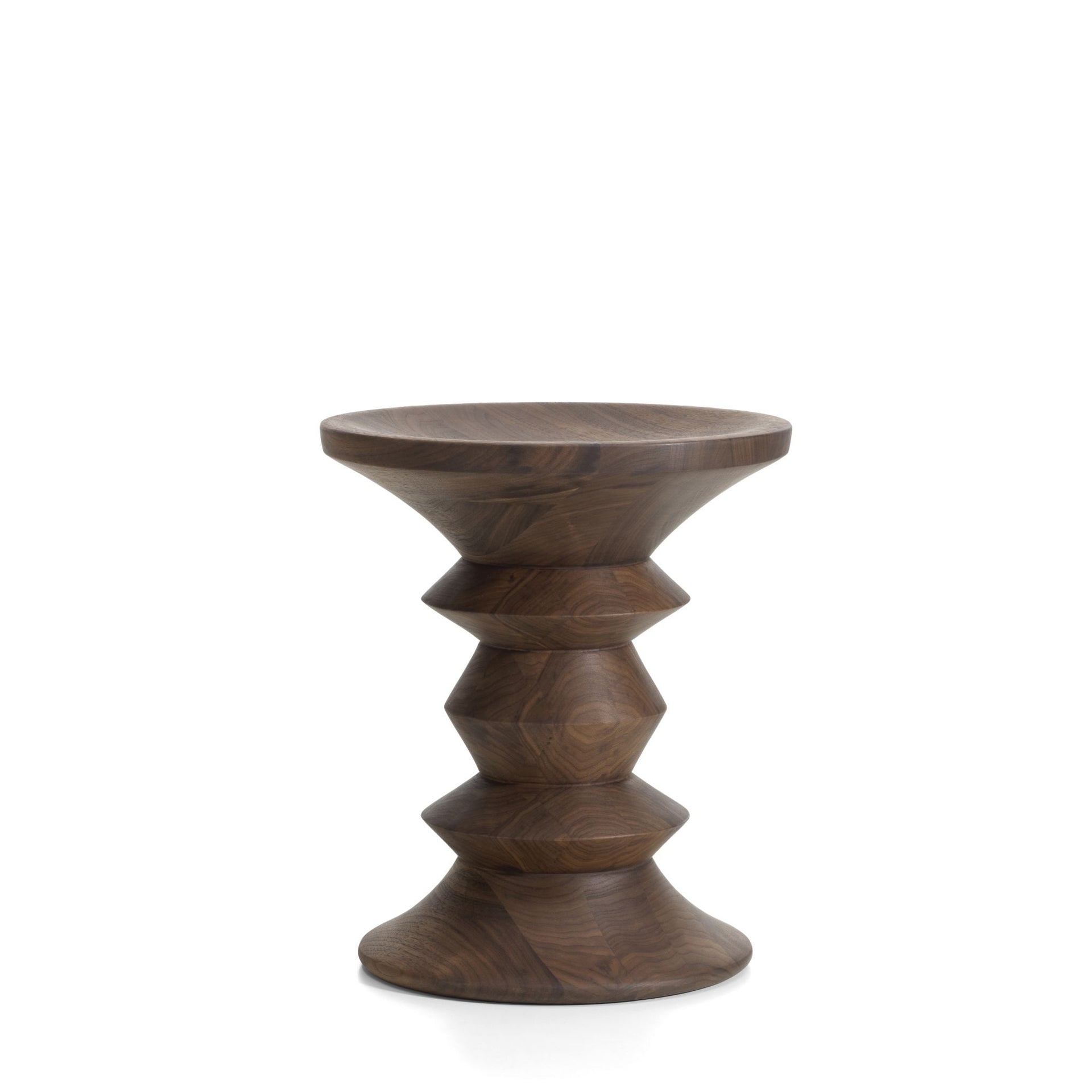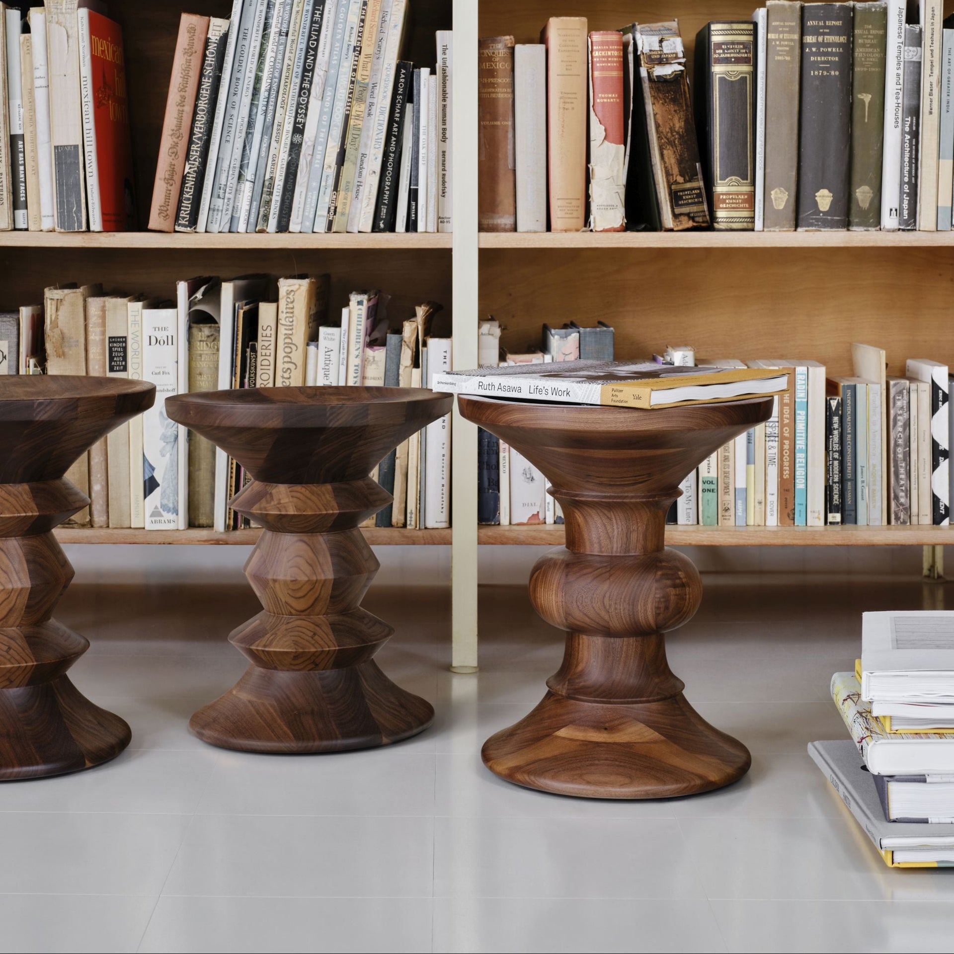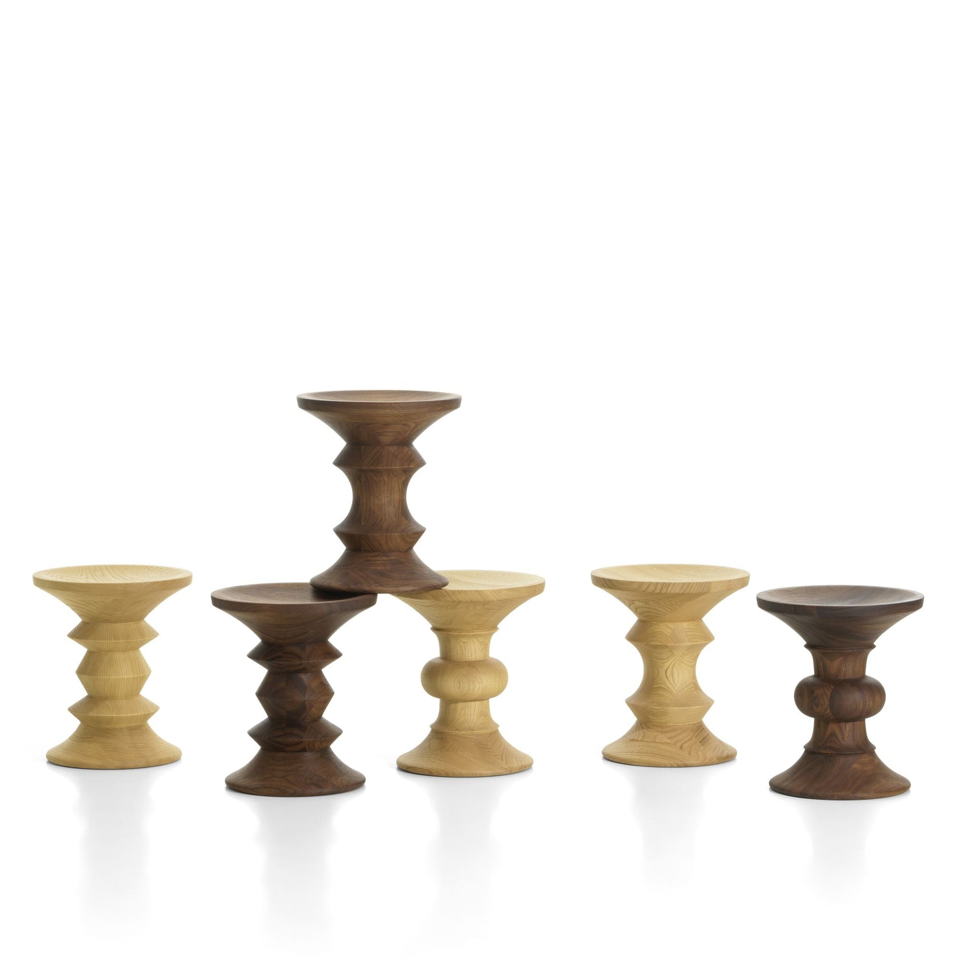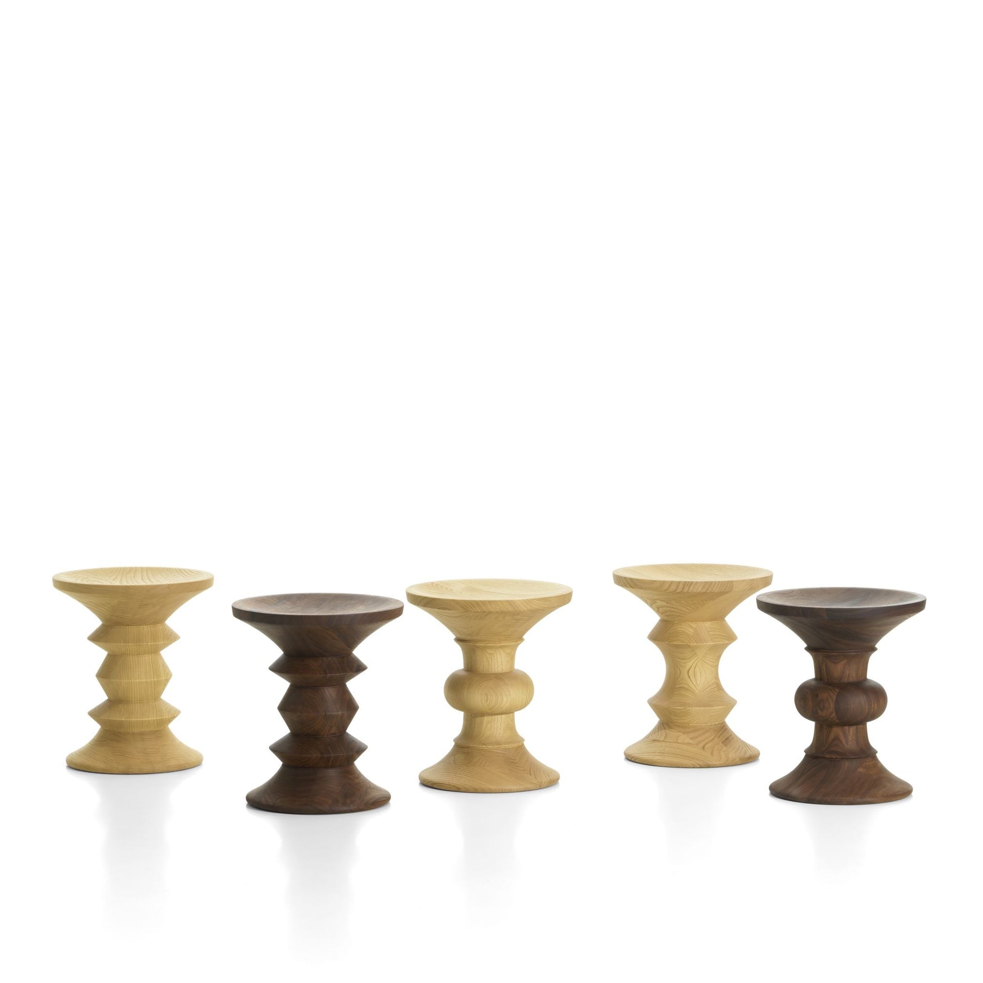 Die charakteristische Formgebung der Stools variiert von Modell zu Modell. Gemeinsam ist ihnen die präzise, symmetrische Konstruktion, die in der Vergangenheit ebenso geschätzt wurde wie heute. Das Massivholz wird sorgfältig ausgewählt und gedrechselt, sodass jede Kontur klar erkennbar bleibt und die natürliche Maserung zur Geltung kommt.
