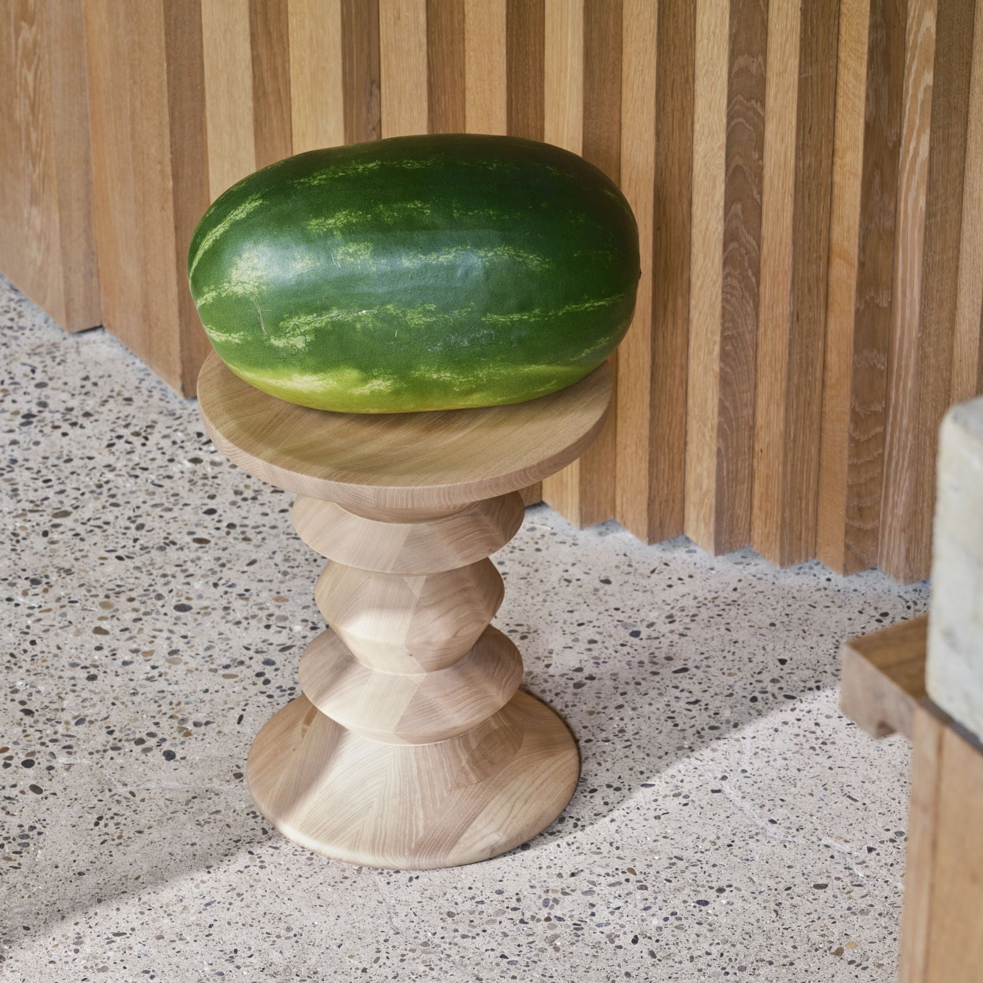 Jeder der verschiedenen Modelle wird aus massivem Nussbaum- oder Kastanienholz gefertigt und zeigt eine gedrechselte Silhouette, die an klassische Handwerkskunst erinnert. Die Hocker dienen als Sitzgelegenheit, Beistelltisch oder skulpturales Objekt – ein vielseitiger Begleiter, der auf traditionelle Weise Beständigkeit vermittelt.