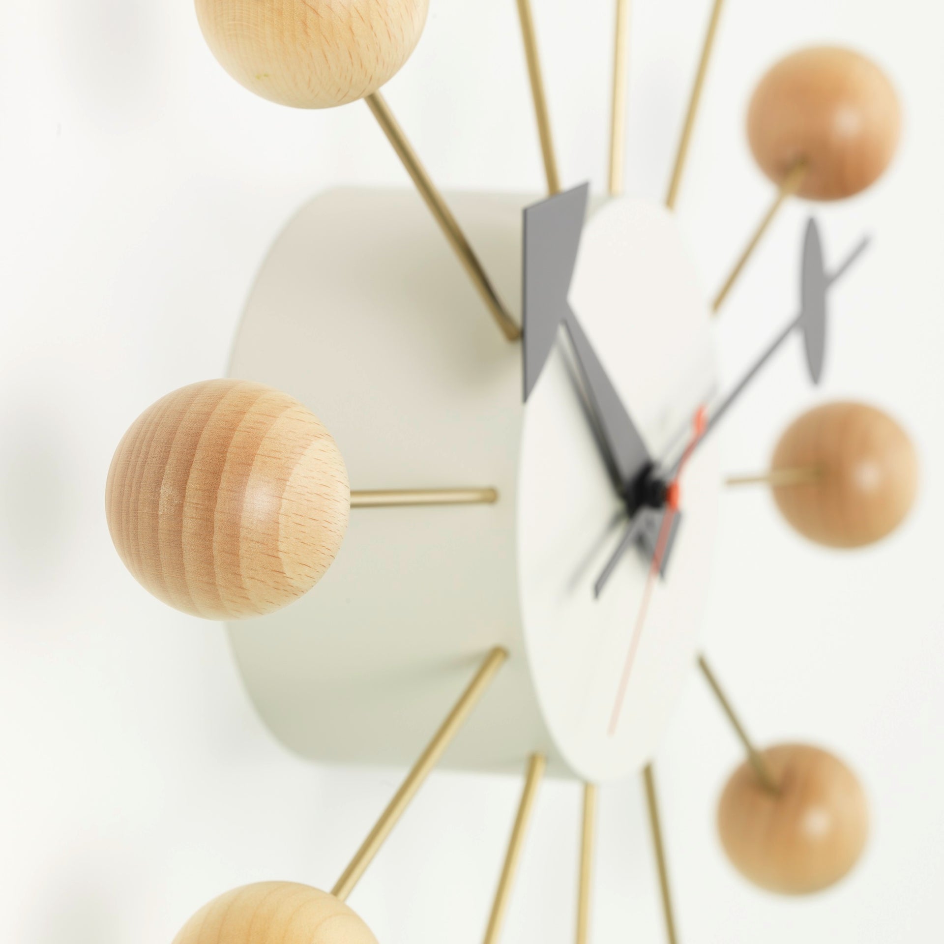 Die Nelson Ball Clock verkörpert den zeitlosen Charme der 1950er Jahre und hebt sich deutlich von herkömmlichen Zeitmessern ab. Ihre skulpturalen Formen und klaren Linien machen die Uhr zu einem stilvollen Eyecatcher, der in jedem Raum sofort ins Auge fällt.